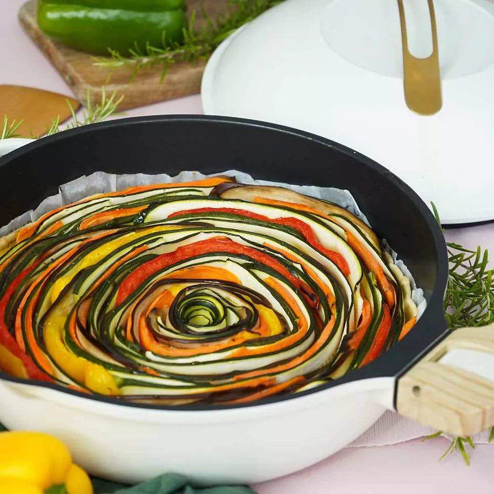 La Poêle COOKUT 8 en 1 La fabuleuse 28cm - Meringue est l'alliée parfaite pour les cuisiniers recherchant à la fois performance et polyvalence. Fabriquée en fonte d'aluminium, elle assure une répartition homogène de la chaleur, permettant une cuisson optimale de vos plats. Avec son revêtement anti-adhérent, elle garantit une cuisson saine et sans accroche, facilitant le nettoyage. Sa couleur blanc meringue apporte une touche d'élégance à votre cuisine. Conçue pour s'adapter à tous les types de feux, y compris l'induction, cette poêle est un véritable atout pour préparer des repas pour 5 personnes et plus, grâce à son généreux diamètre de 28 cm.
