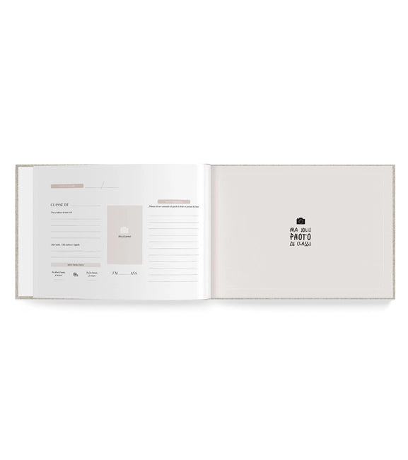 DÉTAILS — Couverture en lin avec marquage à chaud blanc 23,8 x 30,5 cm – 96 pages Adapté pour des photos de classe d’un format maximum de 22,5 x 29 cm Contient 8 périodes scolaire non définies Papier qui garanti la gestion durable des forêts Couverture rigide, reliure dos carré cousue Fabriqué en France